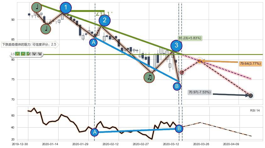 ➢ 预测:2020-03-23,【小幅反弹】稳定目前下跌趋势的前提下,预测价格:79.64