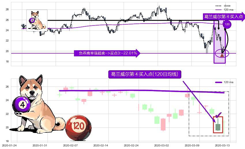 形态多维评估: ⚀ 2020-03-12-日显现 葛兰威尔均线 120日均线 第④买入点 下降趋势均值回复的短线反弹信号,后市看涨,买进信号