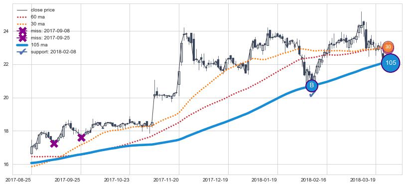上涨趋势2017-08-25-2018-03-22,均线105确认关键支撑1处