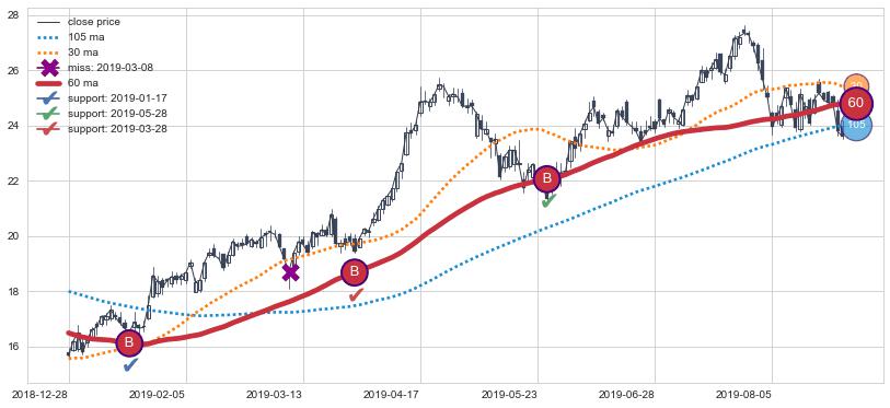 上涨趋势2018-12-28-2019-08-26,均线60确认关键支撑3处