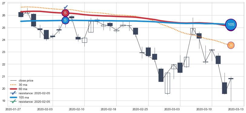 下跌趋势2020-01-27-2020-03-13,均线105, 60确认关键阻力1处