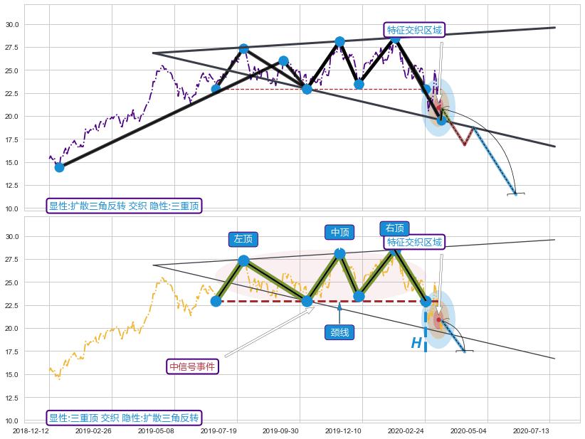 | 5 🅚:上探下跌 ➕ 📐:三重顶下行突破支撑位破位, 猜想持续下沉下跌,被突破的支撑位已变为阻力位 ☞ 看空信号 ⇥ 【🅚线】交织【图形】⇥ 综合量化分数: 48 | > |