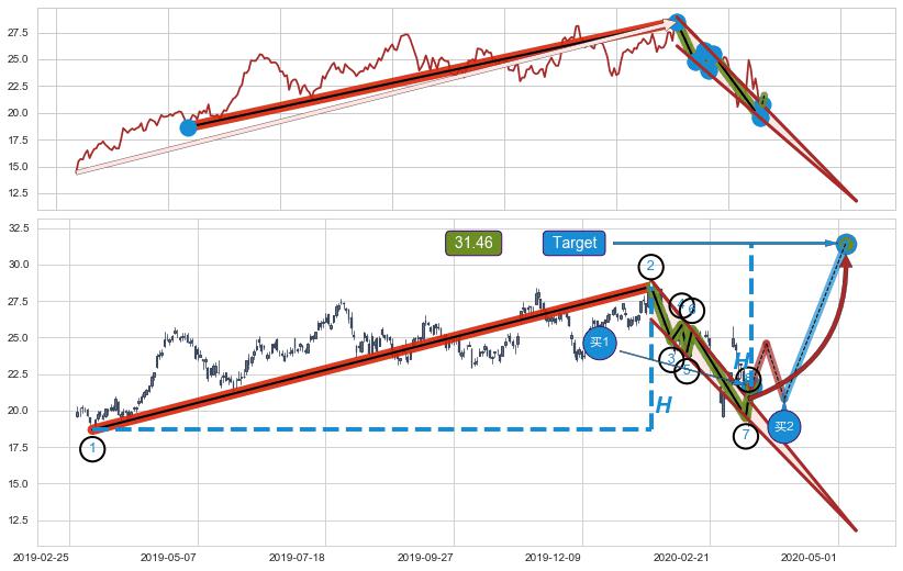 ➢ 高点影线(2020-01-28: 26.59 )→回踩→第二根k线高点(2020-01-27: 26.41 )