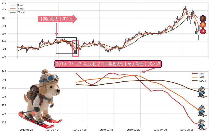 ⚀ 2019-07-05日-2019-08-07日显现 3日-8日-21日均线 【高山滑雪】买入点 看多信号,后市看涨,买入