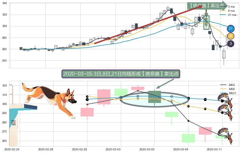 ⚀ 2020-03-05日显现 3日-8日-21日均线 【绝命跳】卖出点 看空信号,后市看跌,卖出