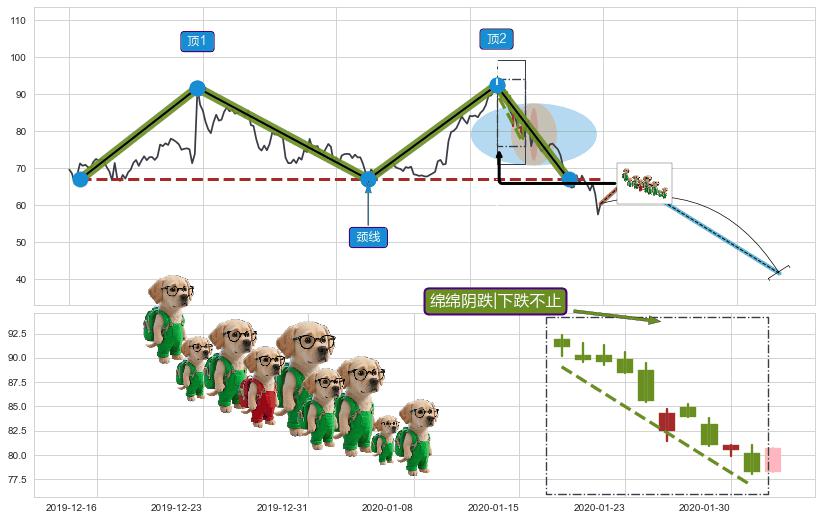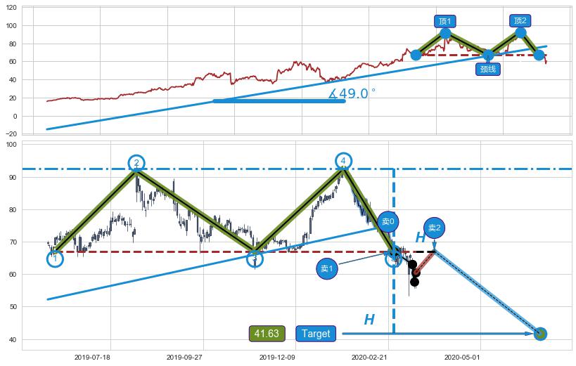| 2 🅚:【断头铡刀】卖出点 ➕ 📐:双重顶下行突破支撑位破位, 猜想持续下沉下跌,被突破的支撑位已变为阻力位 ☞ 看空信号 ⇥ 【均线】交织【图形】⇥ 综合量化分数: 35 | > |