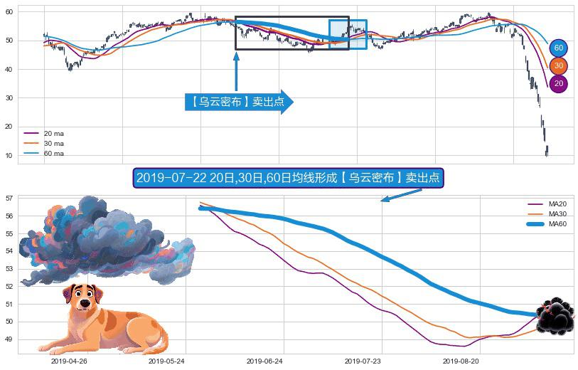 ⚃ 【乌云密布】卖出点长时间对 牛 市转 熊 市进行确认,且均线压制价格走势,但信号发出时间较长,属于【迟滞】看空卖出信号