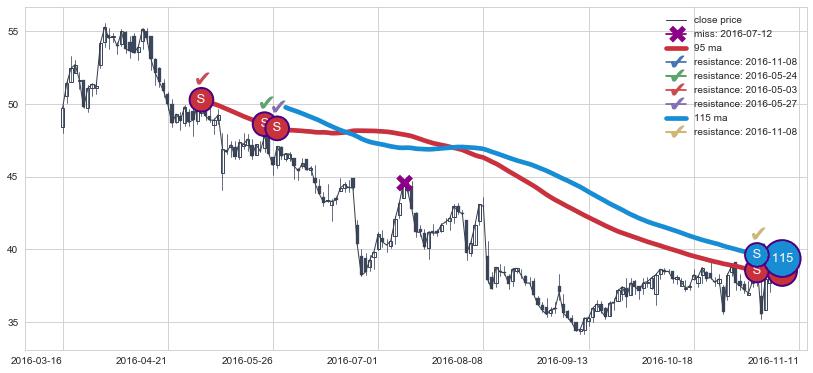 下跌趋势2016-03-16-2016-11-11,均线115, 95确认关键阻力4处