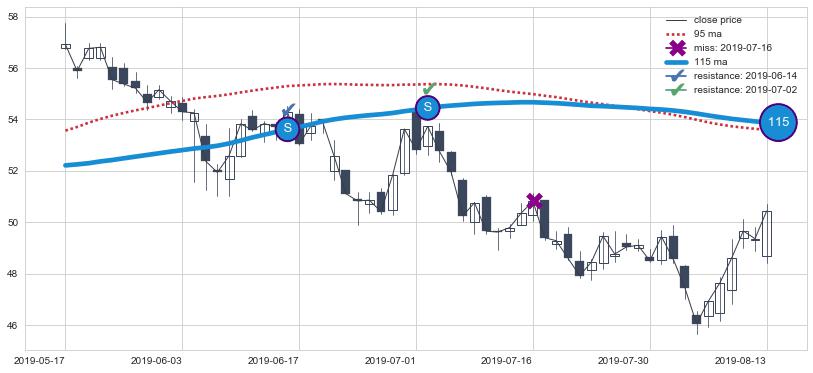 下跌趋势2019-05-17-2019-08-13,均线115确认关键阻力2处