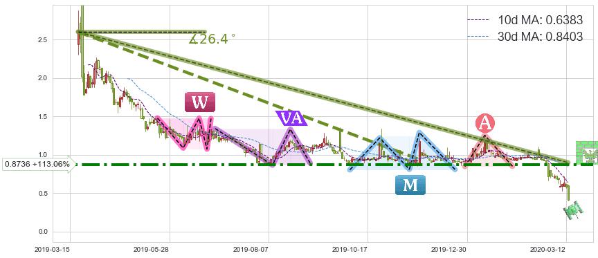 从2019-03-21至2019-11-21,共包含172个交易日,阶段股价下跌-90.48%,阶段股价变动位移路程比: 1 : 6,下跌趋势角度: 34.8