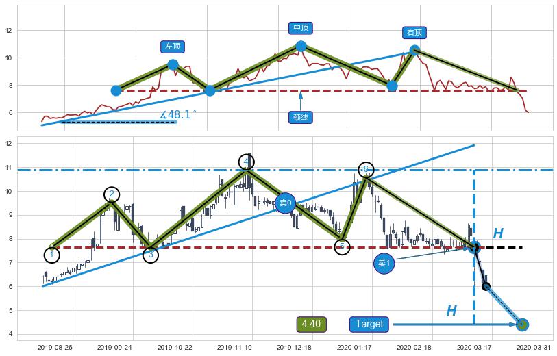 | 8 🅚:顶部尽头线(下山虎) ➕ 📐:三重顶下行突破支撑位破位, 猜想持续下沉下跌,被突破的支撑位已变为阻力位 ☞ 看空信号 ⇥ 【🅚线】交织【图形】⇥ 综合量化分数: 43 | > |