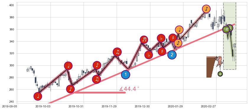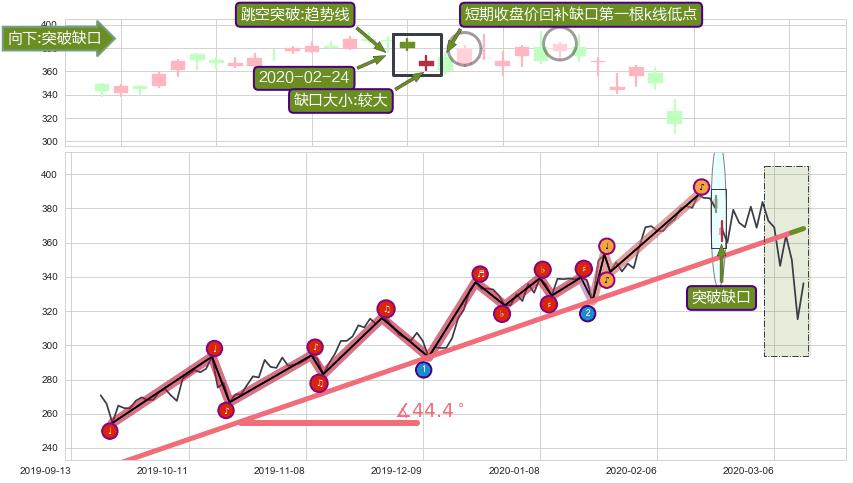 ➣ 2019-09-24-2020-03-11上升趋势存在反转[风险],其原上升趋势的支撑位(368.27)已破位[强阻力信号],原上升趋势角度: 44.4˚
