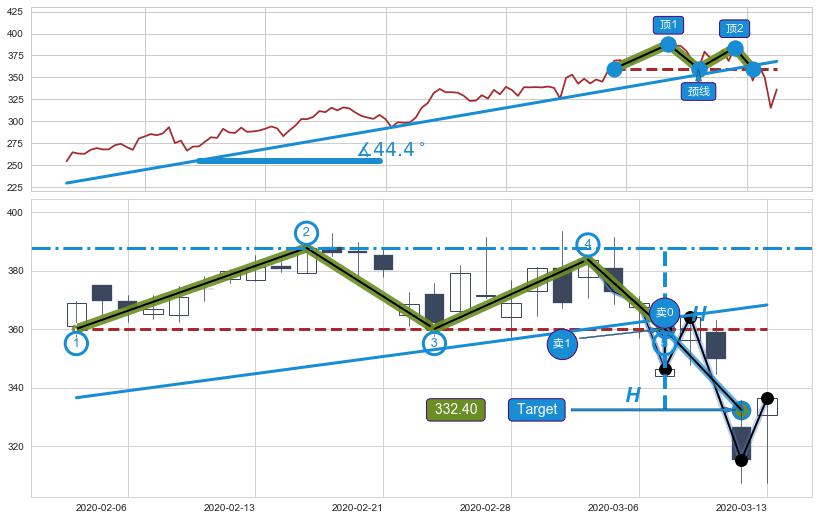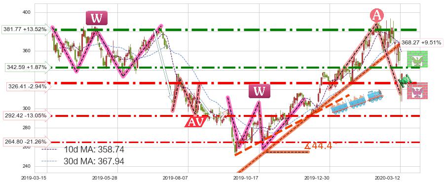 ➣ 【已达成】最小【反转】第一目标价格→(2020-03-12: 332.40 ), 后续继续【反转】下跌动力微弱,下跌较小
