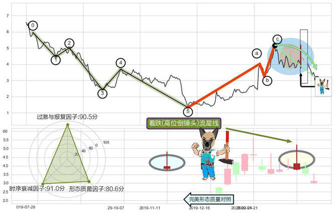 ➣ 看跌(高位倒锤头)流星线 + 波浪理论击穿破位C点继续下跌信号叠加后【目标达成率】偏高,【看空】信号叠加【存续影响降权】