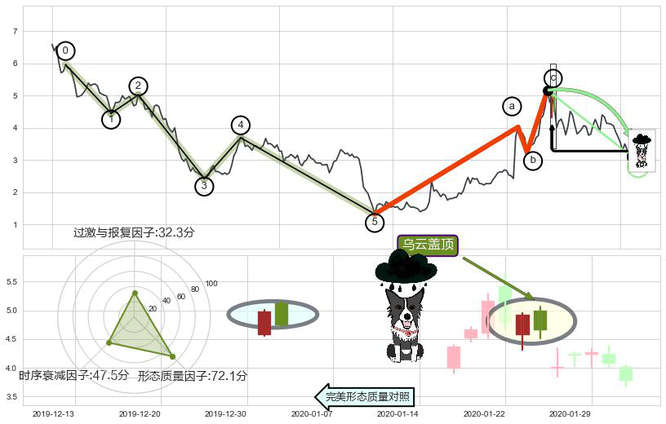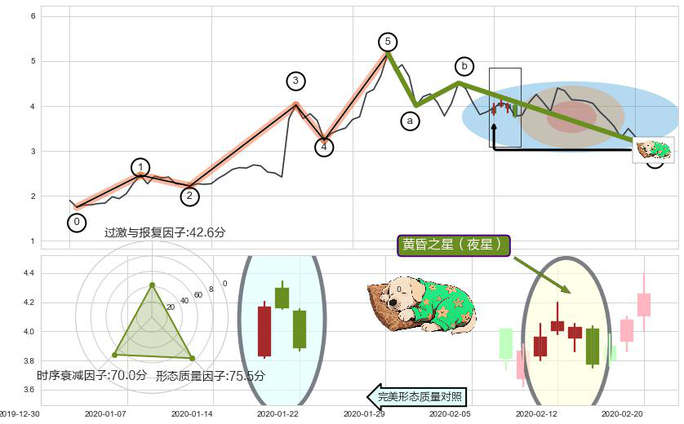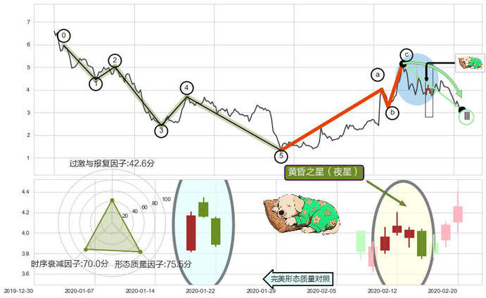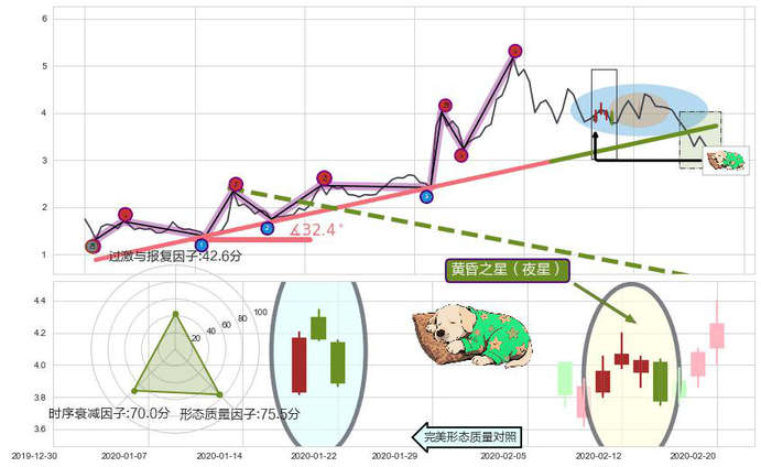 ➢ 🕰 价格走势在2020-02-11至2020-02-14期间形成黄昏之星(夜星),残存影响值:-4.23