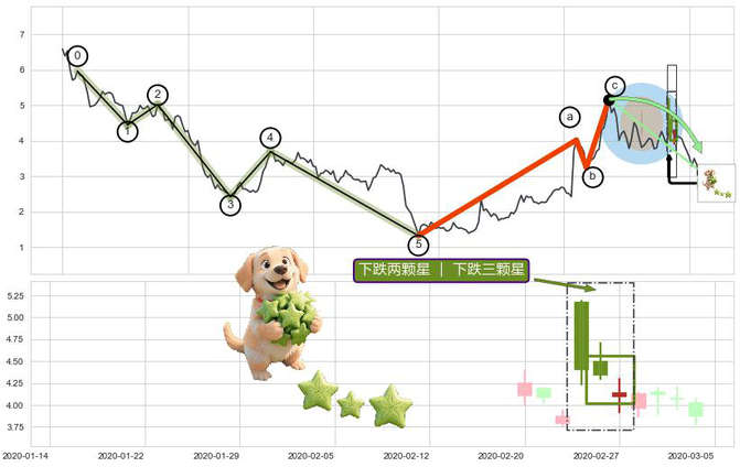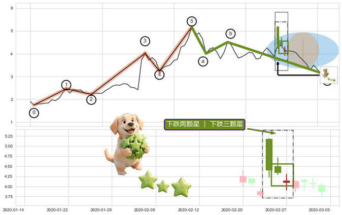 ➢ 🐸 下跌两颗星 | 下跌三颗星形态方向: 消极反向形态,对未来预期 看空