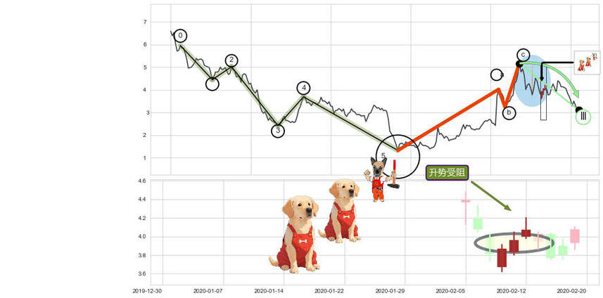 ➢ 波浪理论:猜想击穿突破c点后继续上涨 → 上涨 → 机会信号 → 小趋势跟踪