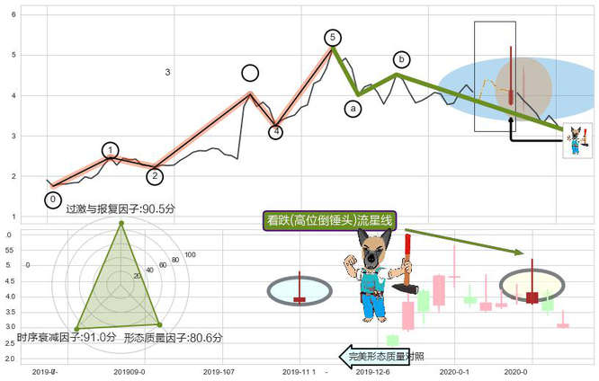 ➢ 看跌(高位倒锤头)流星线 + 波浪理论c点反弹终止反转下跌信号叠加后【目标达成率】中等,【看空】信号叠加【存续影响中等】