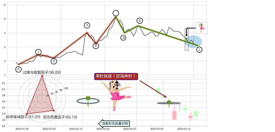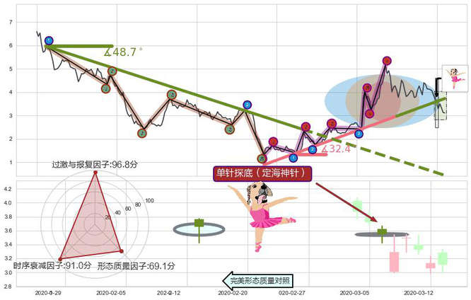 ➢ 🕰 价格走势在2020-03-06至2020-03-06期间形成单针探底(定海神针),残存影响值:5.87