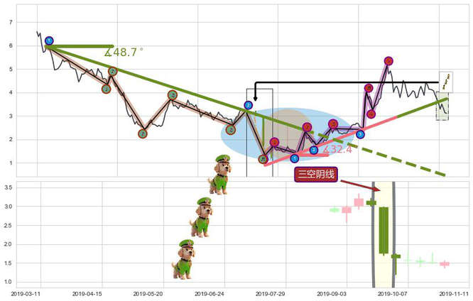 ➣ 2019-03-19-2019-11-04下跌趋势存在反转上涨[机会],其原下跌趋势的阻力位(0.43782)已被突破[强支撑信号],原下跌趋势角度: 48.7˚