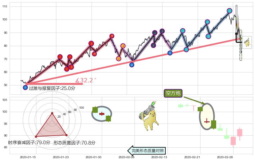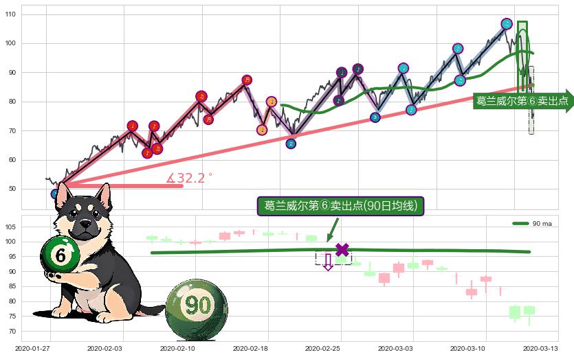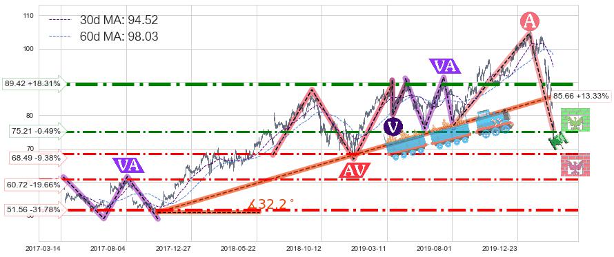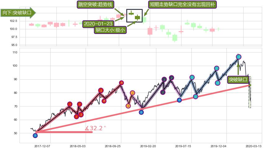 ➣ 2017-10-12-2020-03-11上升趋势存在反转[风险],其原上升趋势的支撑位(85.66)已破位[强阻力信号],原上升趋势角度: 32.2˚