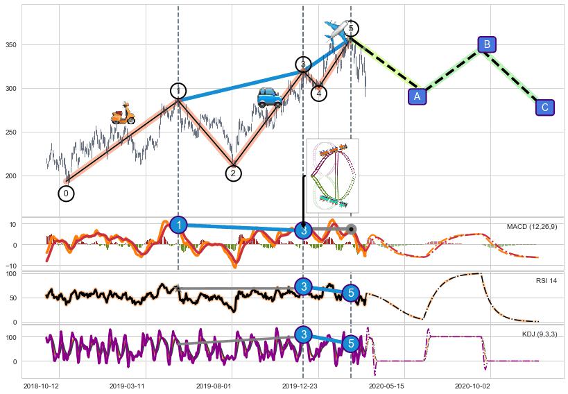 ➣ 1,3,5驱动浪MACD, RSI, KDJ走势都出现【常规背离】反转信号增强