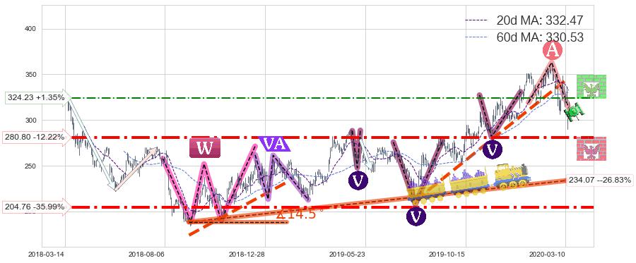 ♘ 支撑价格位280.80,可信任强度82.90%,距离最后交易2020-03-13形成的收盘价格319.90相差 -12.22%
