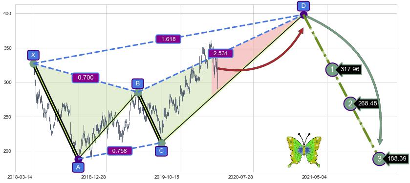 ➣ 未完成【蝴蝶】形态起点X: 2018-03-16, 已到达C点: 2019-08-05, 预测最终D点: 2021-02-03, 共718交易日