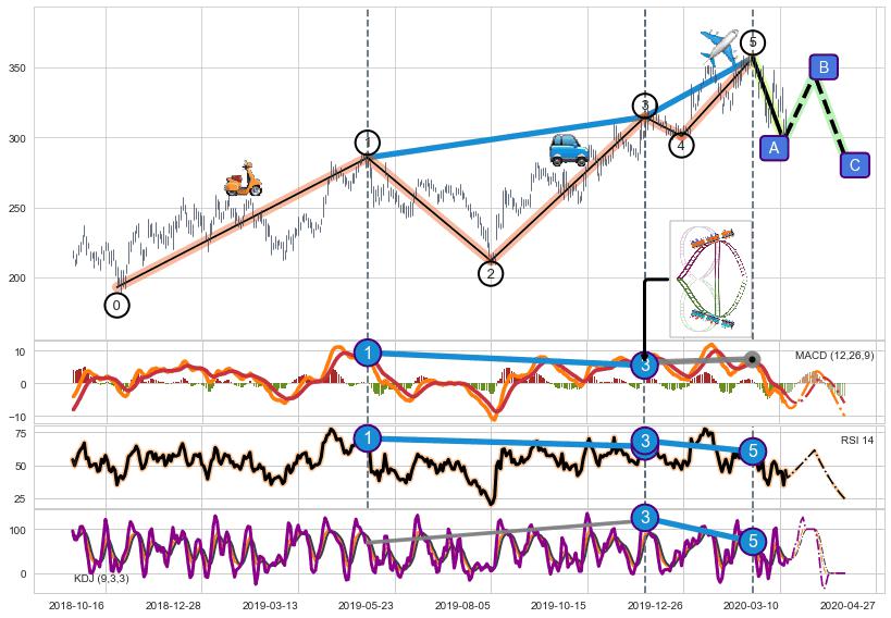 ➢ 1,3,5驱动浪MACD, RSI, KDJ走势都出现【常规背离】反转信号增强