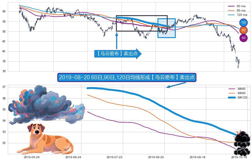 ⚀ 2019-06-27日-2019-10-10日显现 60日-90日-120日均线 【乌云密布】卖出点 看空信号,后市看跌,卖出