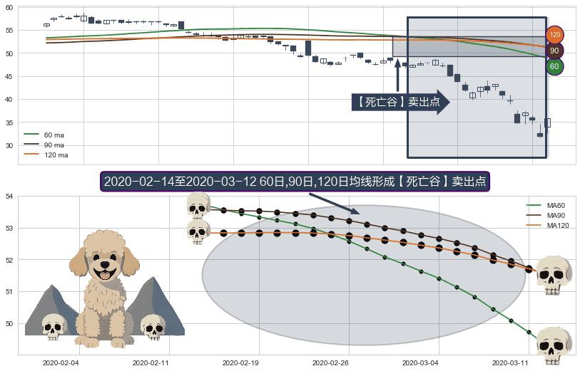 ⚂ 【死亡谷】卖出点 由MA60均线下穿MA90均线和MA120均线,MA90均线下穿MA120均线形成