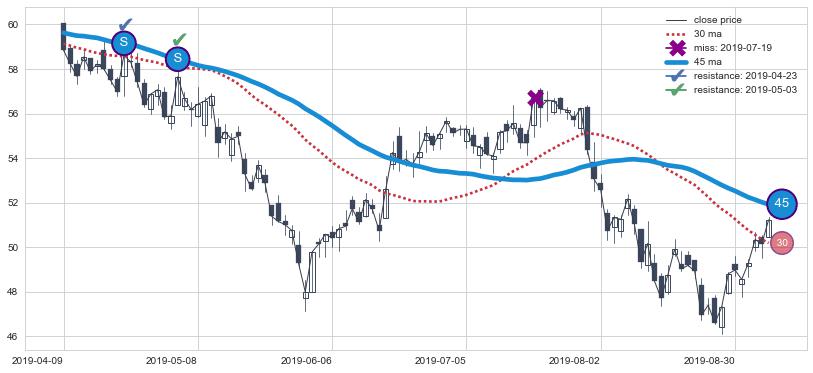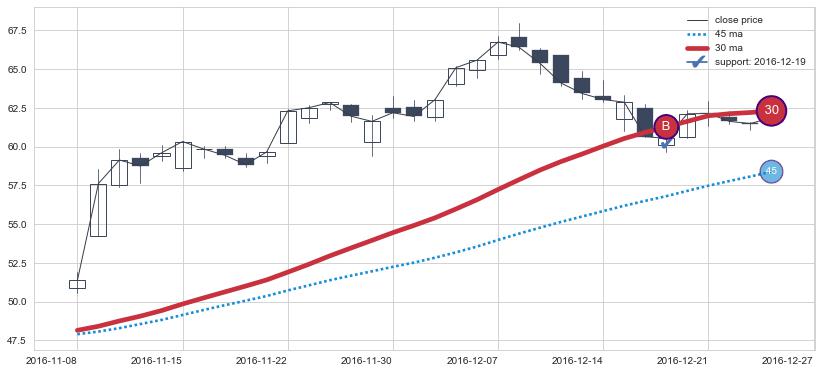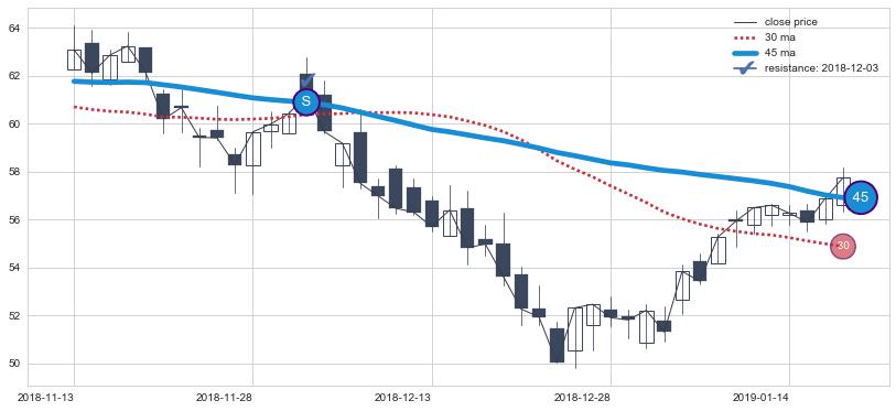⚅ 卖点向下突破均线后,价格不断向下压低,不断远离均线,气势如虹,均线强斥力助跌
