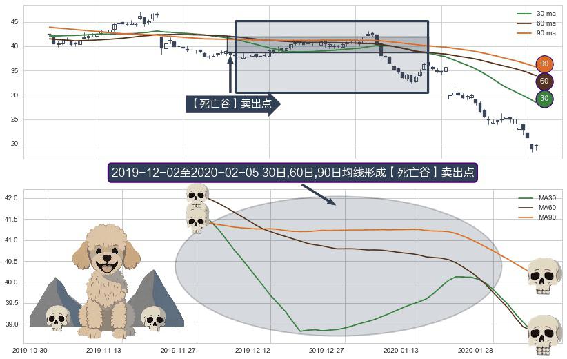 形态多维评估: ⚀ 2019-12-03-日至2020-02-05-日显现 30日-60日-90日均线 【死亡谷】卖出点 看空信号,后市看跌,卖出
