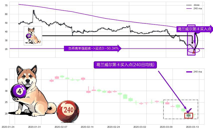 形态多维评估: ⚀ 2020-03-12-日显现 葛兰威尔均线 240日均线 第④买入点 下降趋势均值回复的短线反弹信号,后市看涨,买进信号
