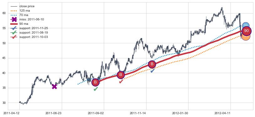 上涨趋势2011-04-12-2012-04-30,均线90确认关键支撑3处
