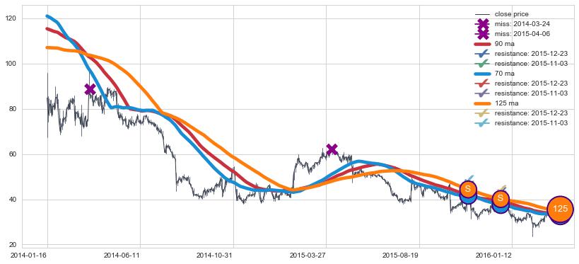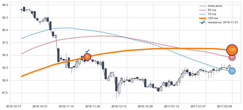 下跌趋势2014-01-16-2016-03-10,均线90, 125, 70确认关键阻力2处