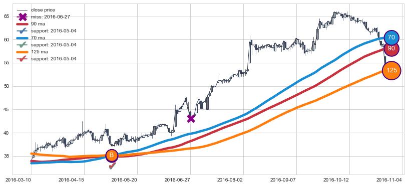 上涨趋势2016-03-10-2016-11-04,均线90, 125, 70确认关键支撑1处