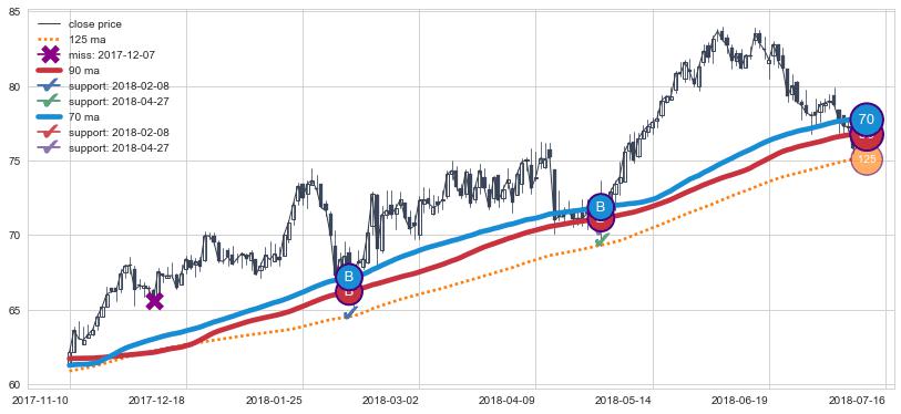 上涨趋势2017-11-10-2018-07-16,均线90, 70确认关键支撑2处