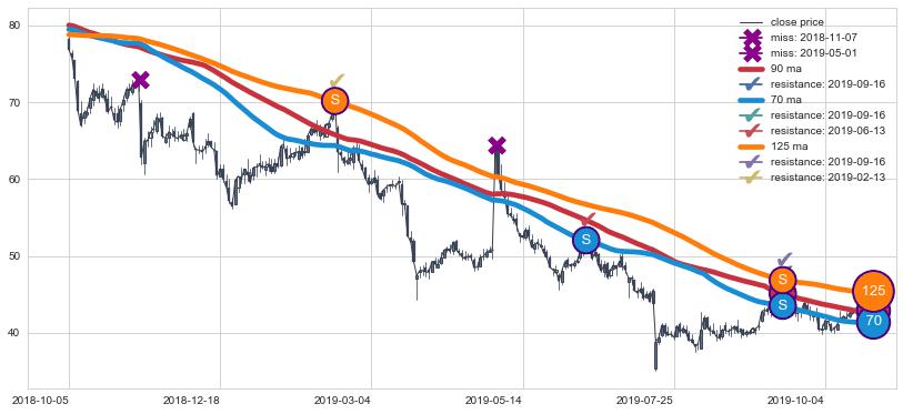下跌趋势2018-10-05-2019-10-18,均线90, 125, 70确认关键阻力3处