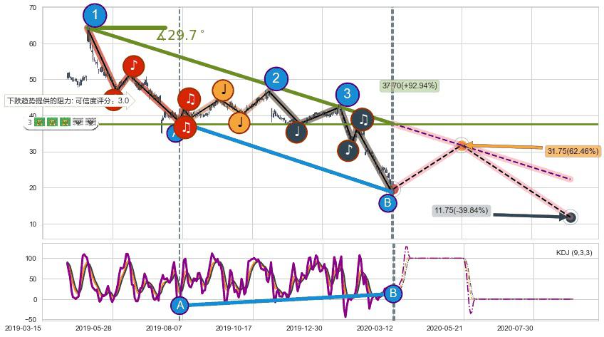 从2019-05-01至2020-03-13,共包含220个交易日,阶段股价下跌-109.46%,阶段股价变动位移路程比: 1 : 3,下跌趋势角度: 29.7