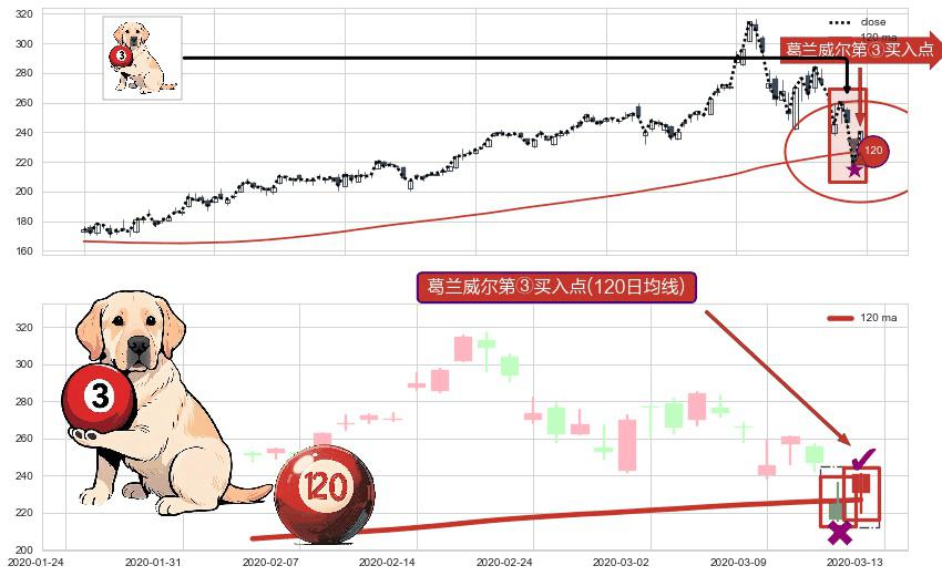 形态多维评估: ⚀ 2020-03-13-日显现 葛兰威尔均线 120日均线 第③买入点 上升趋势的中继信号,后市看涨,买进信号