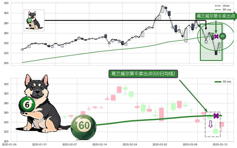 形态多维评估: ⚀ 2020-03-11-日显现 葛兰威尔均线 60日均线 第⑥卖出点 走势反转见顶信号,后市看跌,卖出信号