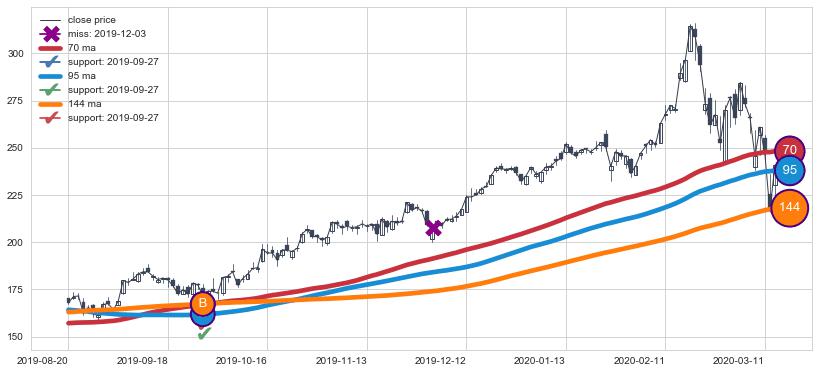 上涨趋势2019-08-20-2020-03-13,均线144, 70, 95确认关键支撑1处