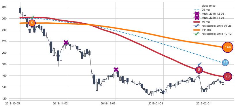 下跌趋势2018-10-05-2019-02-08,均线144, 70确认关键阻力2处