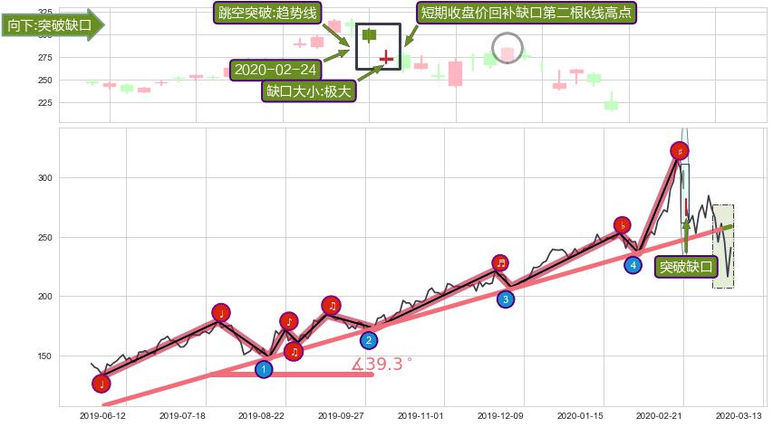 ➢ 收盘价(2020-03-04: 284.51 )→回踩→第二根k线高点(2020-02-24: 281.87 )