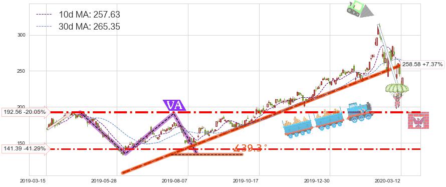 ✂️ 2019-06-03-2020-03-11上升趋势存在反转[风险],其原上升趋势的支撑位(258.58)已破位[强阻力信号],原上升趋势角度: 39.3˚