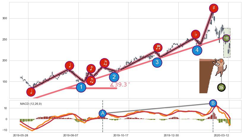 从2019-06-03至2020-03-11,共包含196个交易日,阶段股价上涨68.09%,阶段股价变动位移路程比: 1 : 5,上涨趋势角度: 39.3