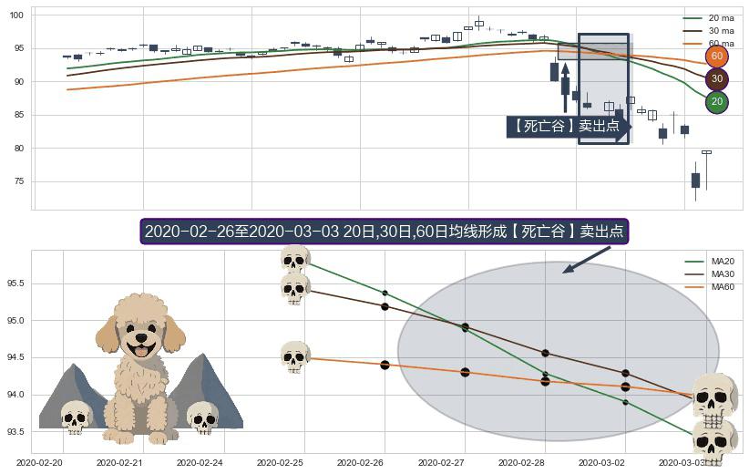 ⚂ 【死亡谷】卖出点 由MA20均线下穿MA30均线和MA60均线,MA30均线下穿MA60均线形成
