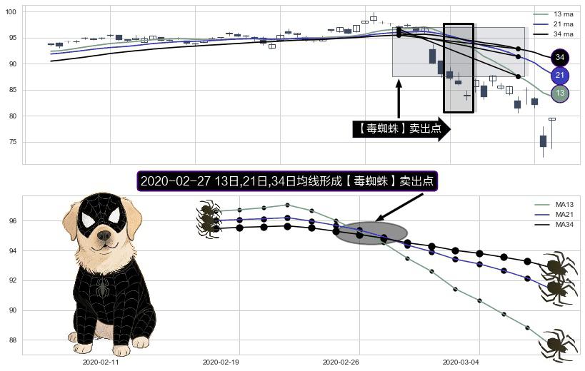 形态多维评估: ⚀ 2020-02-27日显现 13日-21日-34日均线 【毒蜘蛛】卖出点 看空信号,后市看跌,卖出