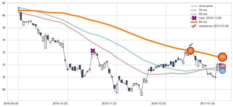 下跌趋势2016-09-28-2017-01-26,均线89确认关键阻力1处